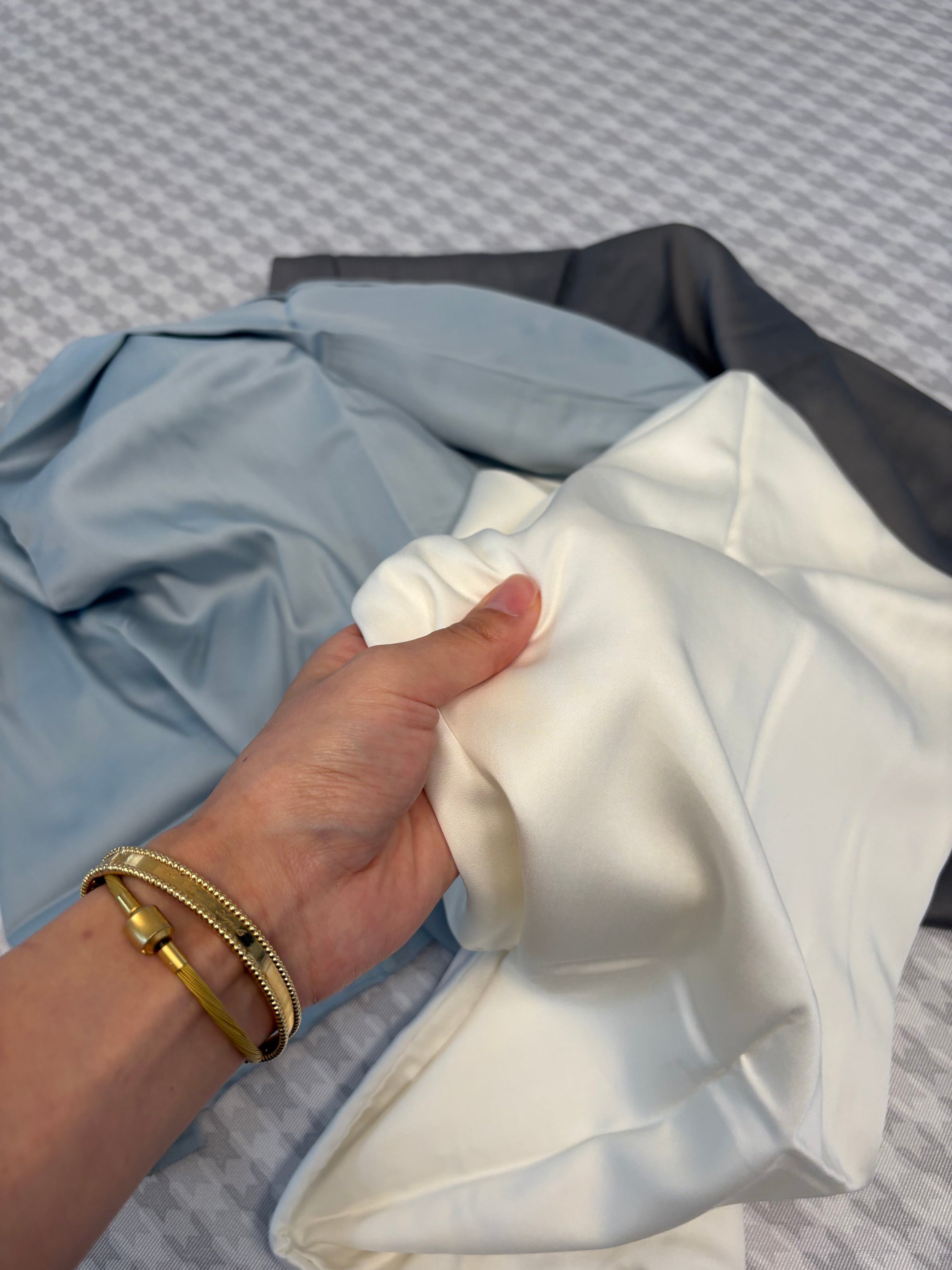 上个月我认识了一个住YF的朋友,家里也是做家纺的。跟我说他们开发了一种新的天丝面料,是北美市场没有的。这个面料混纺了 78%的兰精天丝和 22%的🌿薄荷纤维,特别适合夏天用。这「🌿薄荷」一听就凉快啊!所以我就立刻要了些样品来测试。