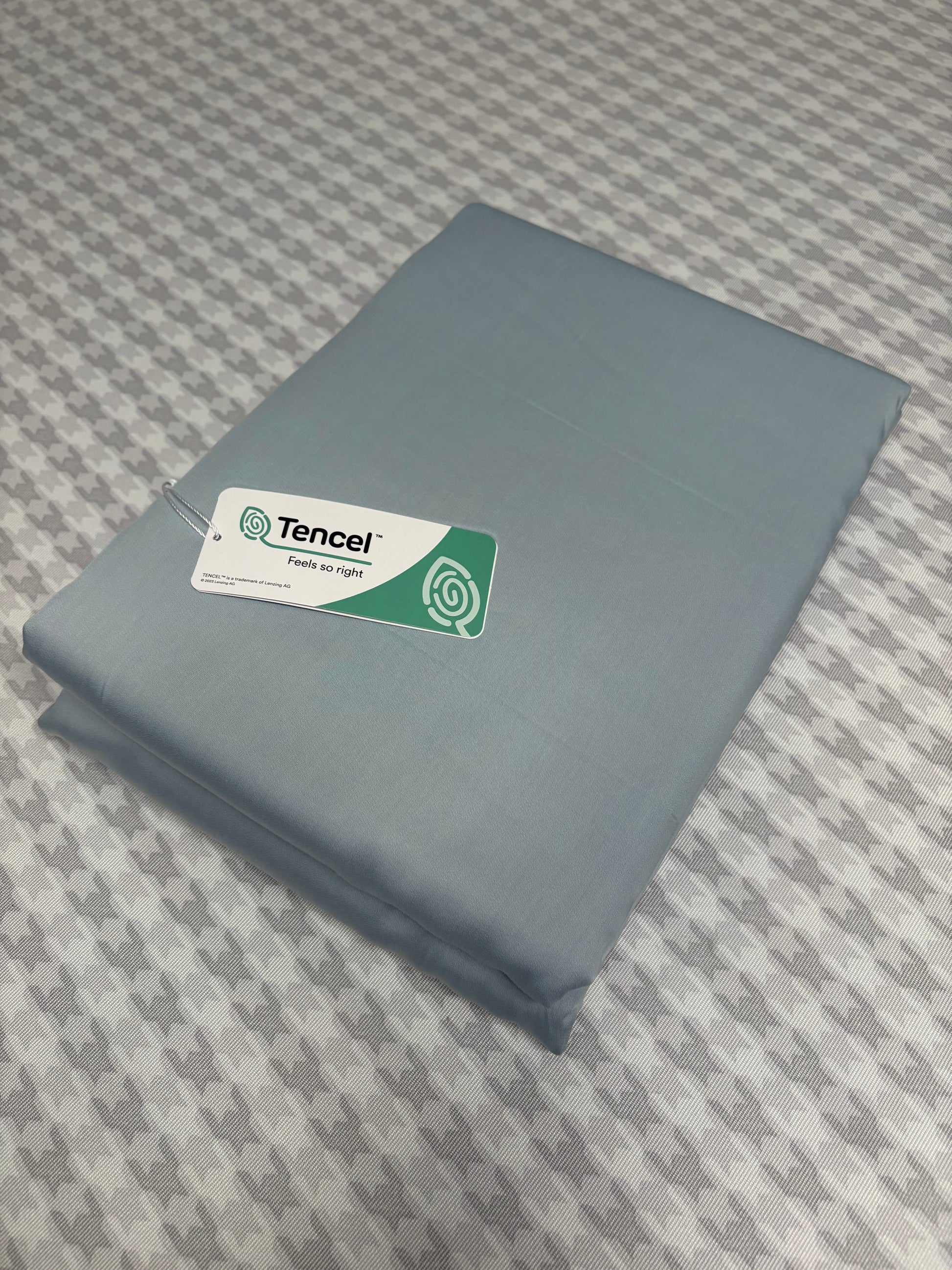 上个月我认识了一个住YF的朋友,家里也是做家纺的。跟我说他们开发了一种新的天丝面料,是北美市场没有的。这个面料混纺了 78%的兰精天丝和 22%的🌿薄荷纤维,特别适合夏天用。这「🌿薄荷」一听就凉快啊!所以我就立刻要了些样品来测试。